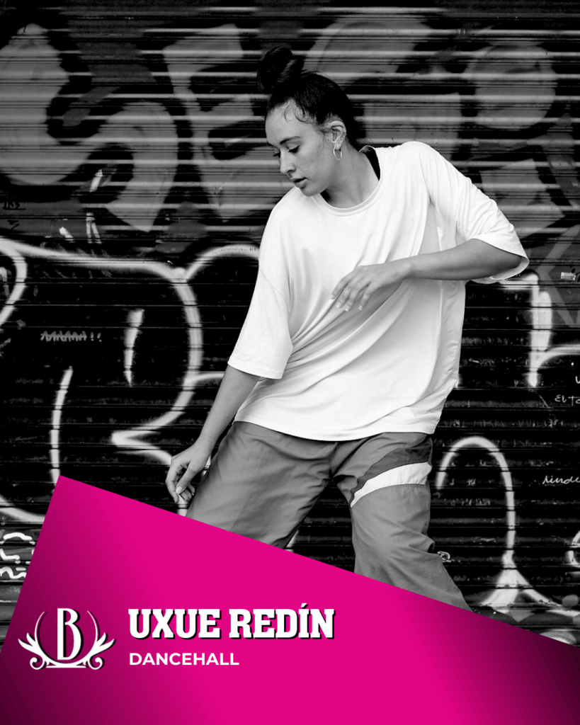 Uxue Redin es bailarina de danzas urbanas, formada desde los 12 años en Breathless Dance Center, donde ha crecido y consolidado su técnica en Hip Hop, Dancehall, House, Locking, Popping y Commercial.